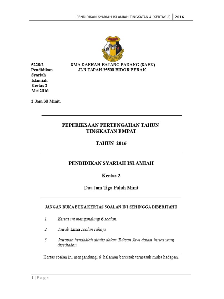 Contoh Soalan Pendidikan Syariah Islamiah Tingkatan 4kertas 2